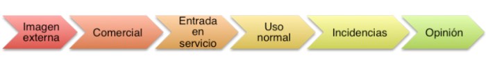 El proceso de experiencia de cliente, también llamado viaje del cliente, lo podemos dividir en seis fases que van desde el primer conocimiento de la marca hasta la opinión generada por el cliente, una vez ha comprobado la calidad de servicio.