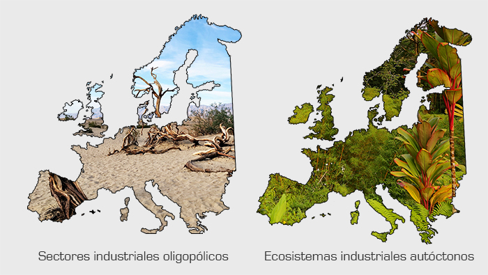 - Ecosistemas industriales autóctonos compuestos por organizaciones independientes que cooperan entre sí, frente a sectores industriales oligopólicos.