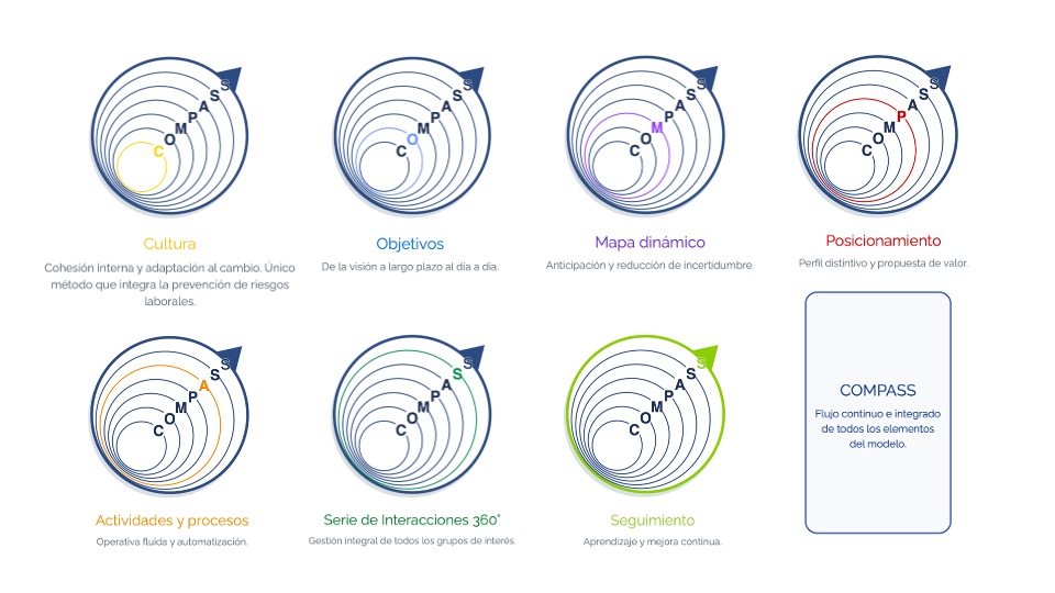 El método Compass rompe esas divisiones y, a partir de las siete letras que componen el acrónimo, aborda los elementos clave de una gestión excelente: